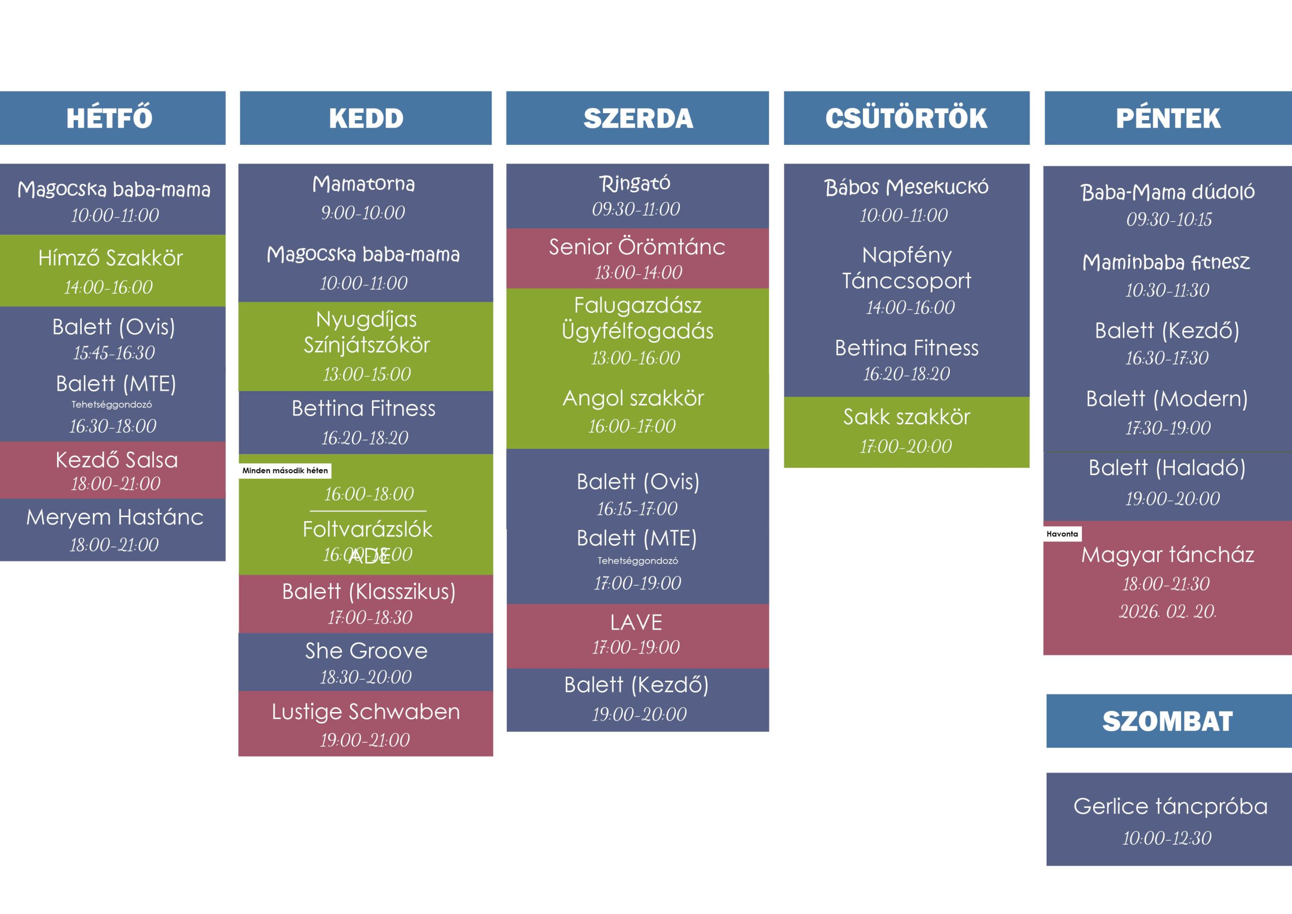 Állandó foglalkozások órarendje a művelődési házban